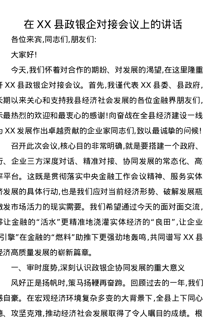在XX县政银企对接会议上的讲话