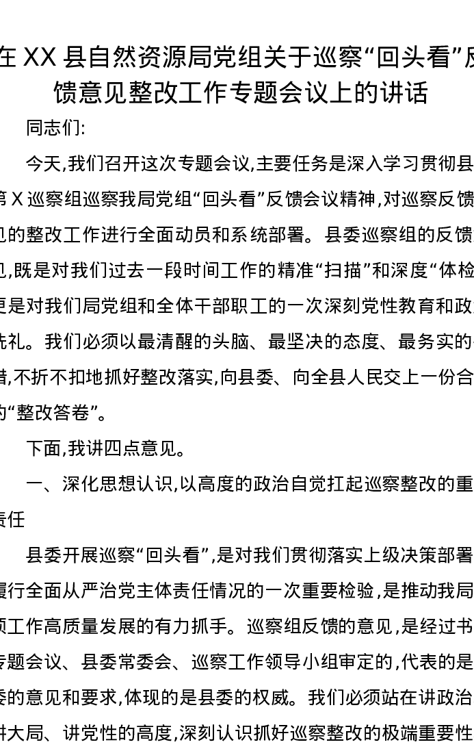 在XX县自然资源局党组关于巡察“回头看”反馈意见整改工作专题会议上的讲话