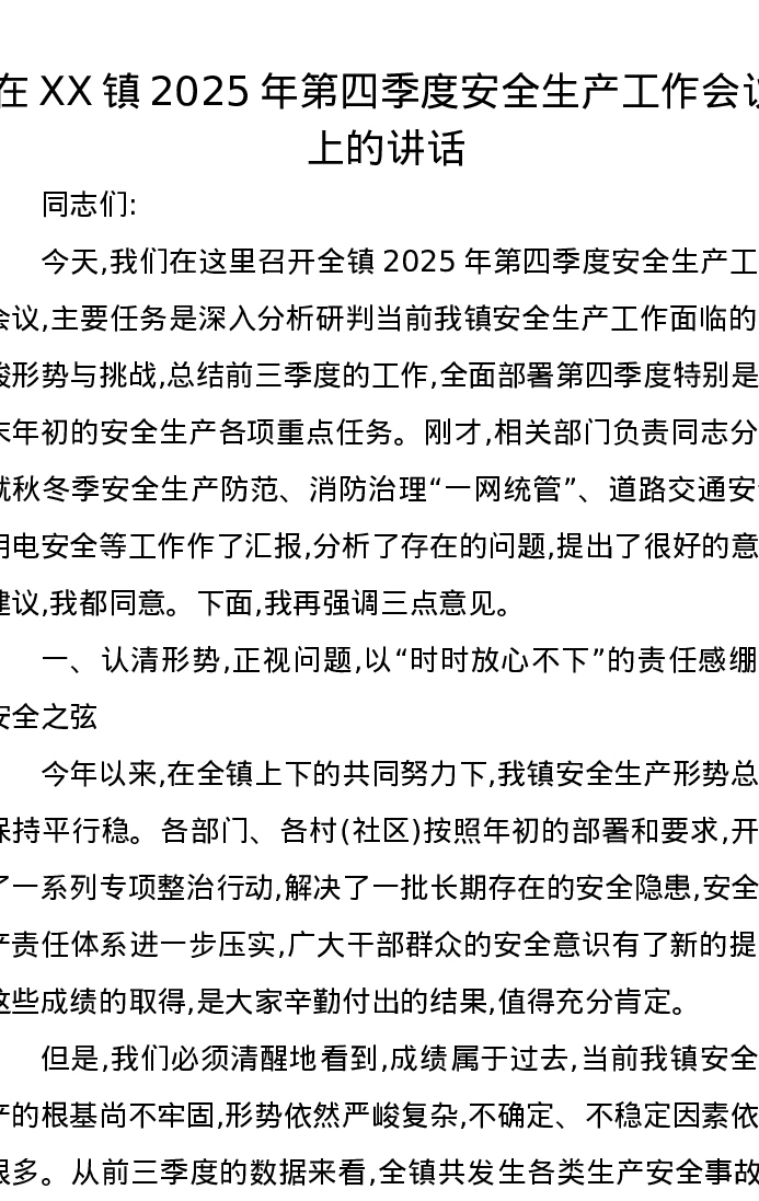 在XX镇2025年第四季度安全生产工作会议上的讲话