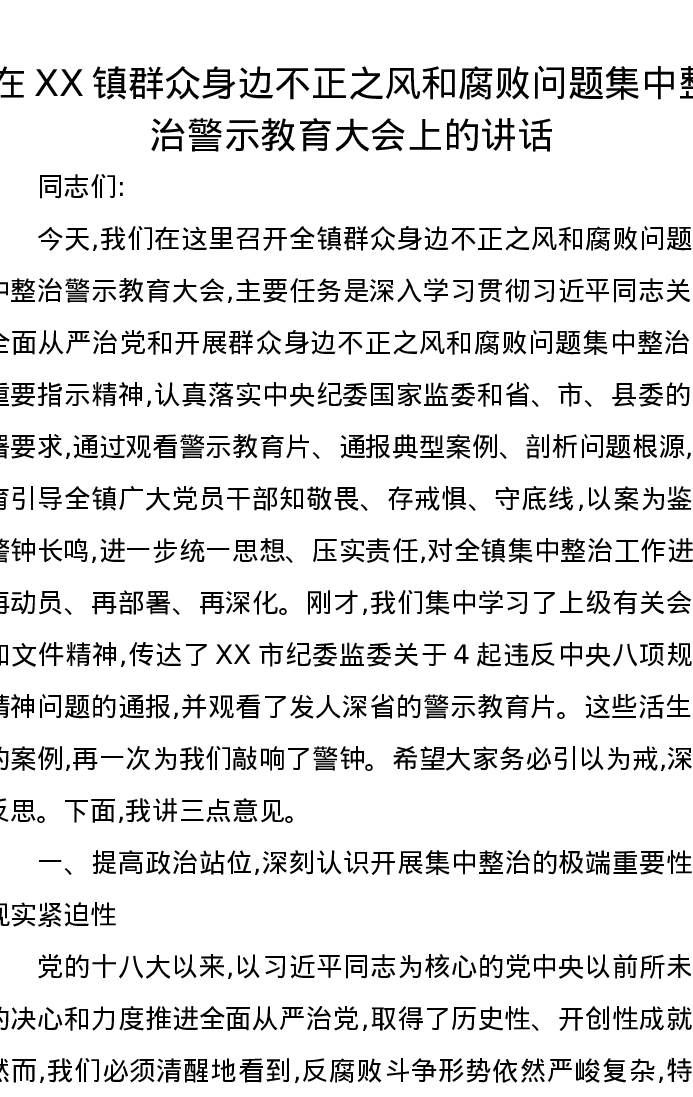 在XX镇群众身边不正之风和腐败问题集中整治警示教育大会上的讲话