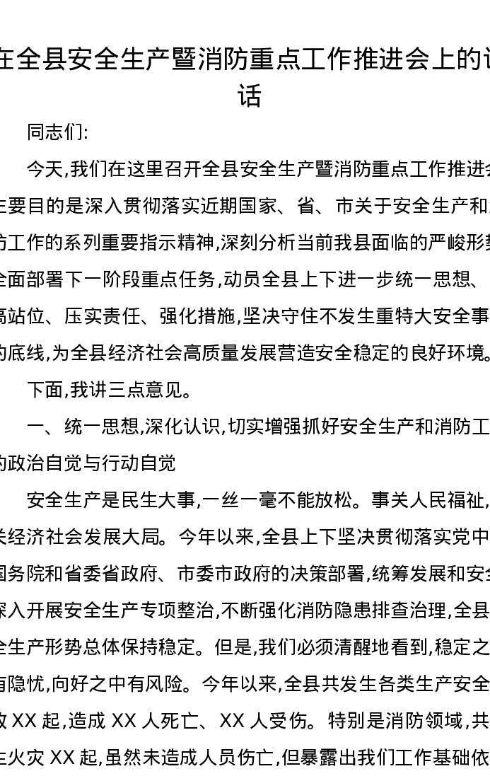 在全县安全生产暨消防重点工作推进会上的讲话
