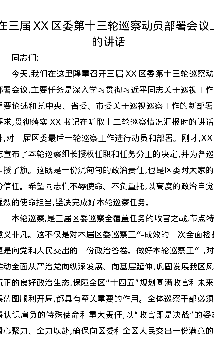 在三届XX区委第十三轮巡察动员部署会议上的讲话