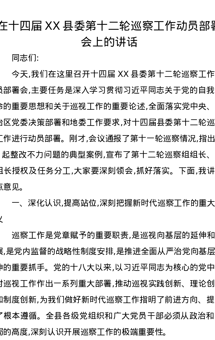 在十四届XX县委第十二轮巡察工作动员部署会上的讲话