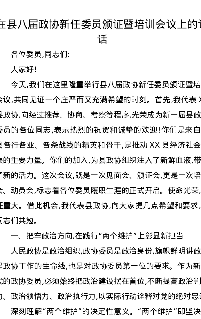 在县八届政协新任委员颁证暨培训会议上的讲话