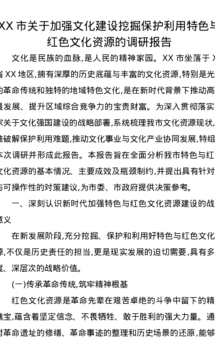 XX市关于加强文化建设挖掘保护利用特色与红色文化资源的调研报告