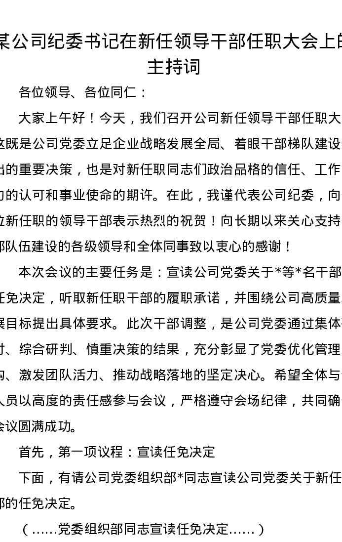 某公司纪委书记在新任领导干部任职大会上的主持词