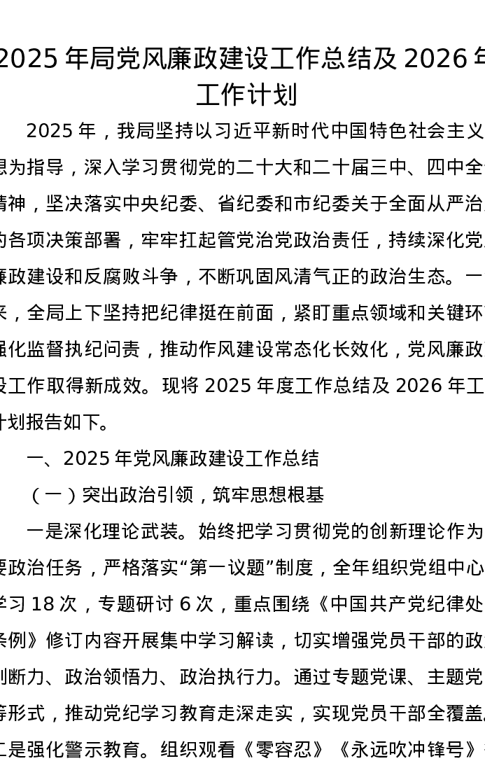 2025年局党风廉政建设工作总结及2026年工作计划