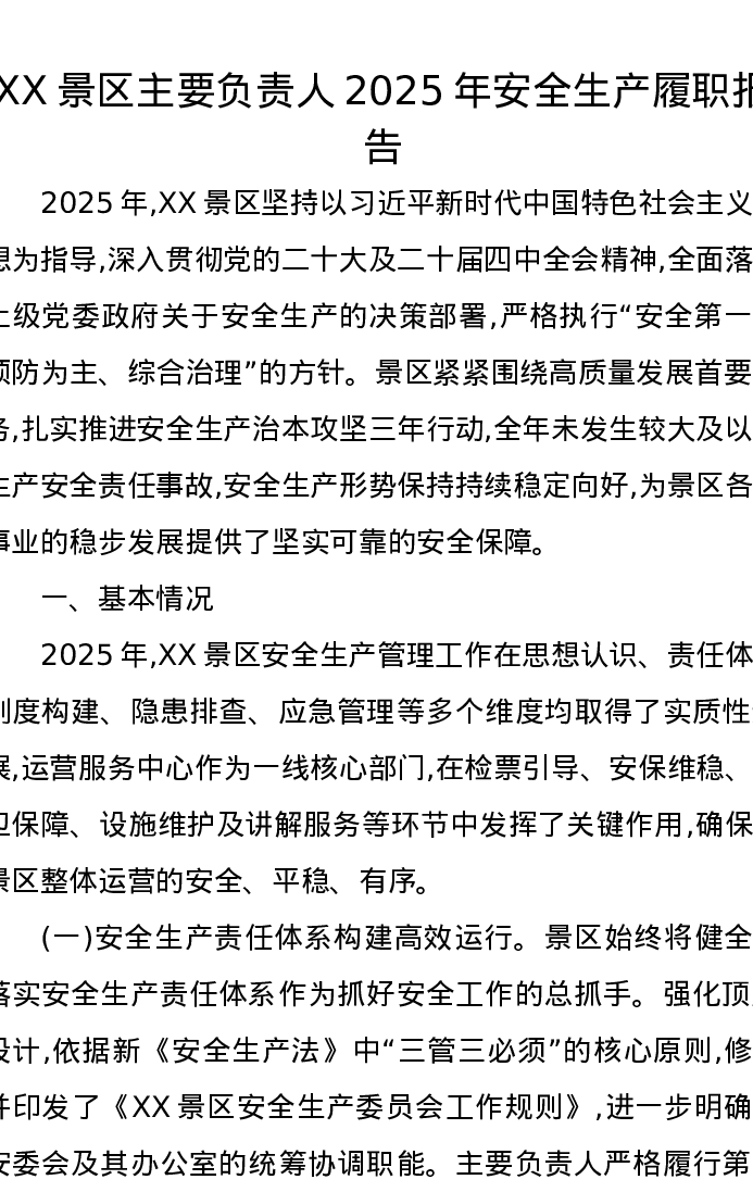 XX景区主要负责人2025年安全生产履职报告