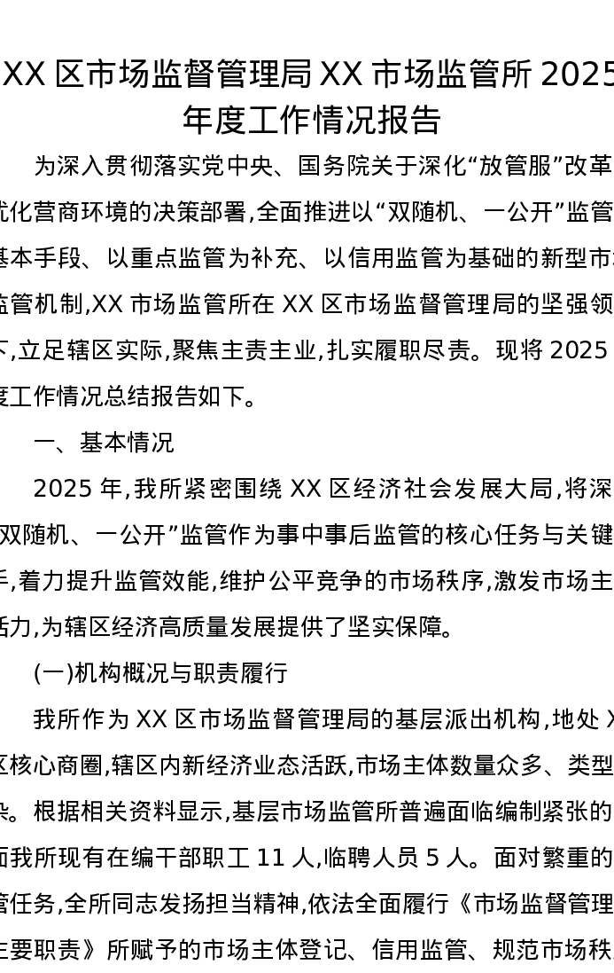 XX区市场监督管理局XX市场监管所2025年度工作情况报告