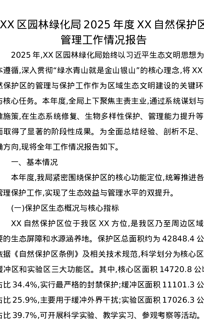 XX区园林绿化局2025年度XX自然保护区管理工作情况报告