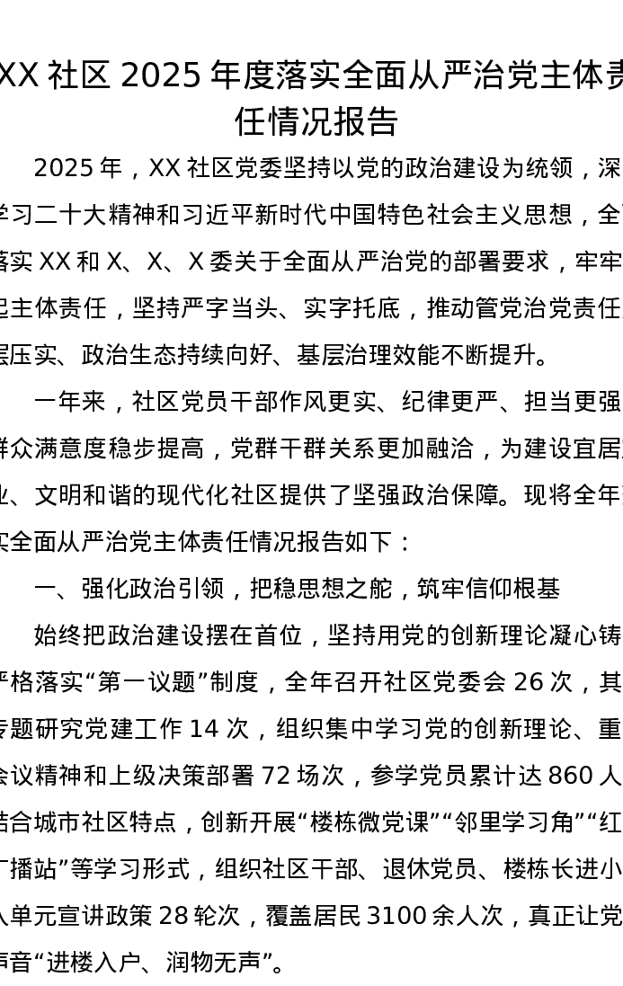 XX社区2025年度落实全面从严治党主体责任情况报告