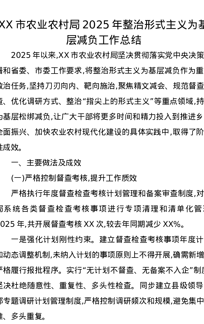 XX市农业农村局2025年整治形式主义为基层减负工作总结