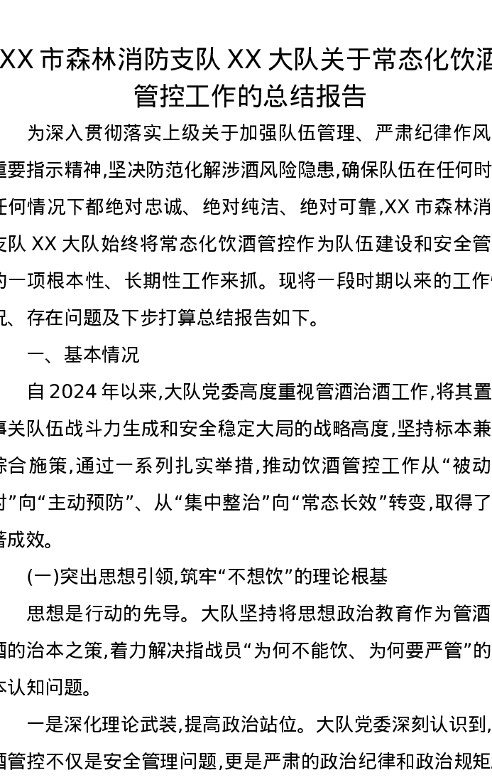 XX市森林消防支队XX大队关于常态化饮酒管控工作的总结报告
