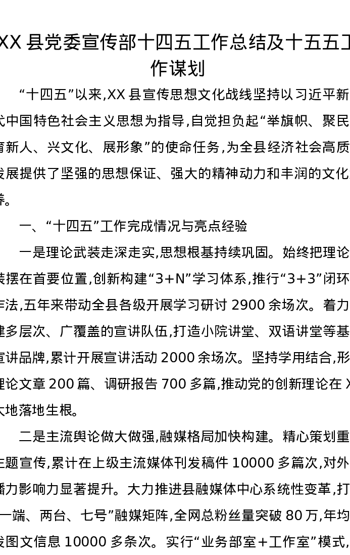 XX县党委宣传部十四五工作总结及十五五工作谋划