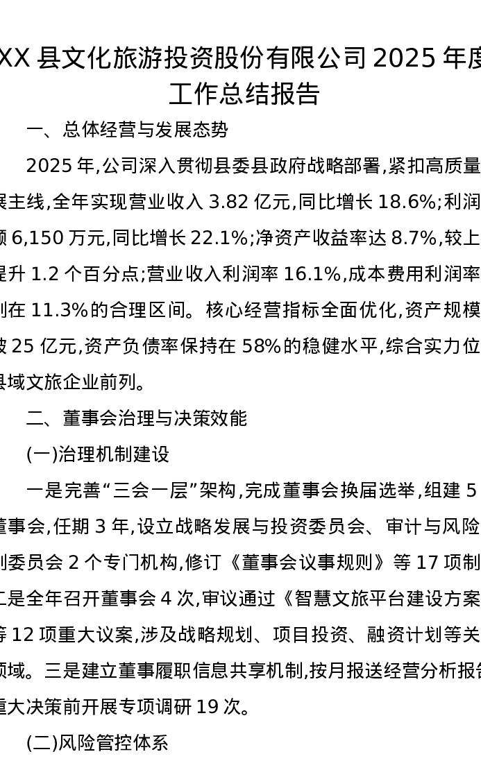 XX县文化旅游投资股份有限公司2025年度工作总结报告