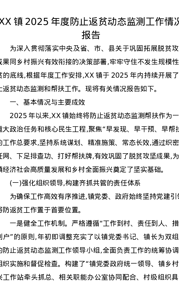 XX镇2025年度防止返贫动态监测工作情况报告
