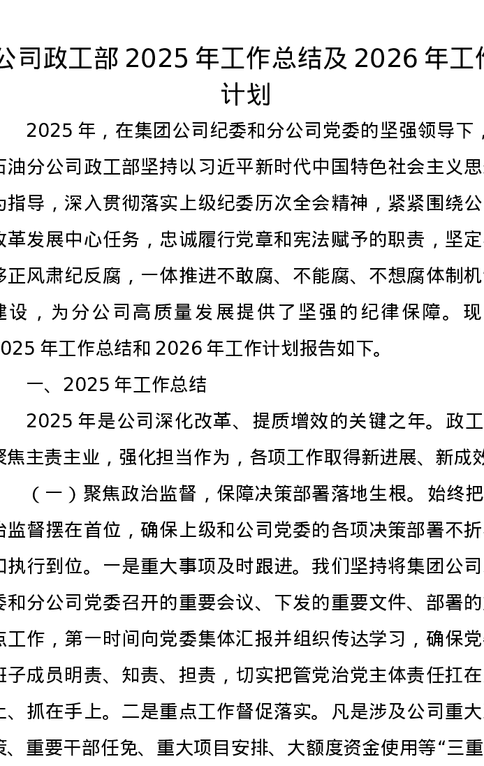 公司政工部2025年工作总结及2026年工作计划