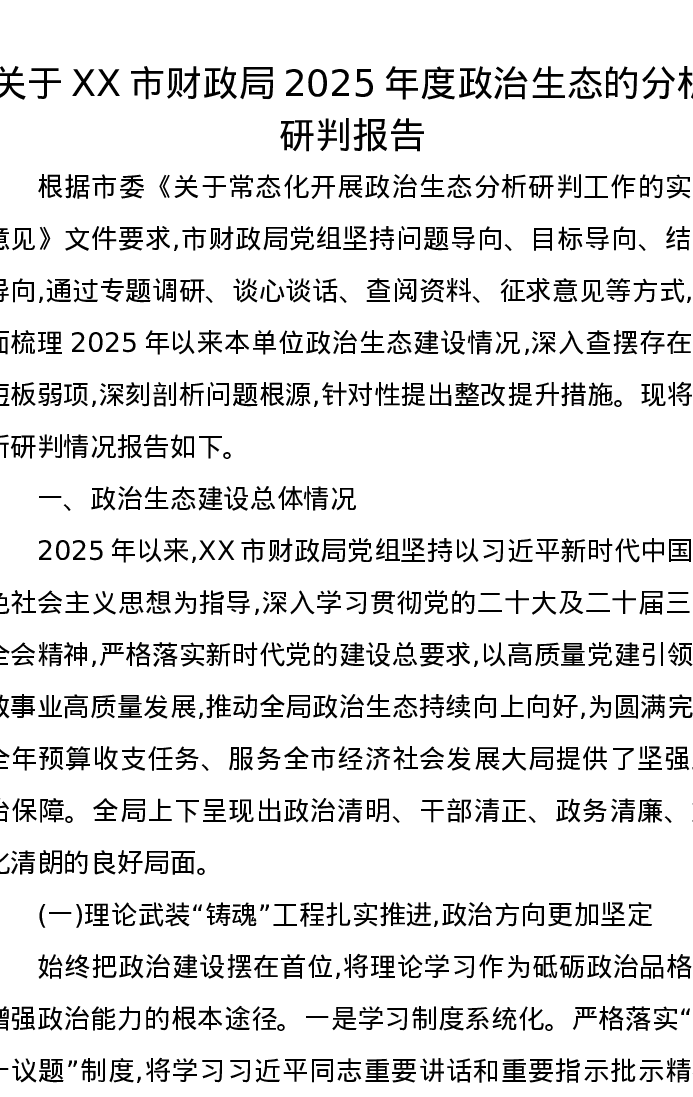 关于XX市财政局2025年度政治生态的分析研判报告