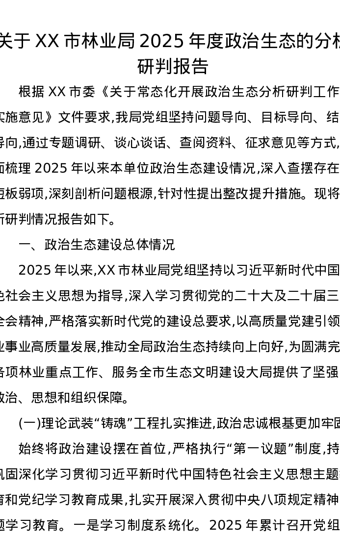 关于XX市林业局2025年度政治生态的分析研判报告