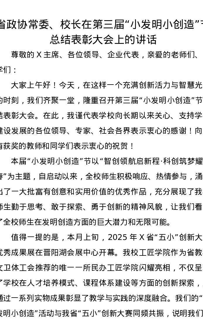 省政协常委、校长在第三届“小发明小创造”节总结表彰大会上的讲话
