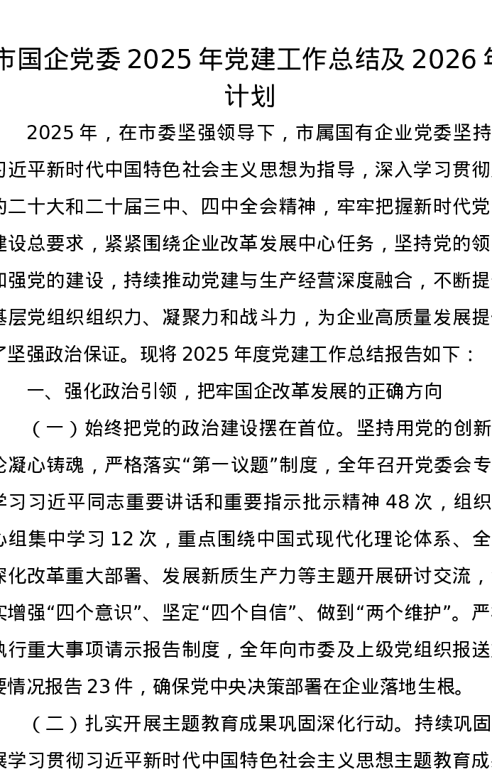 市国企党委2025年党建工作总结及2026年计划