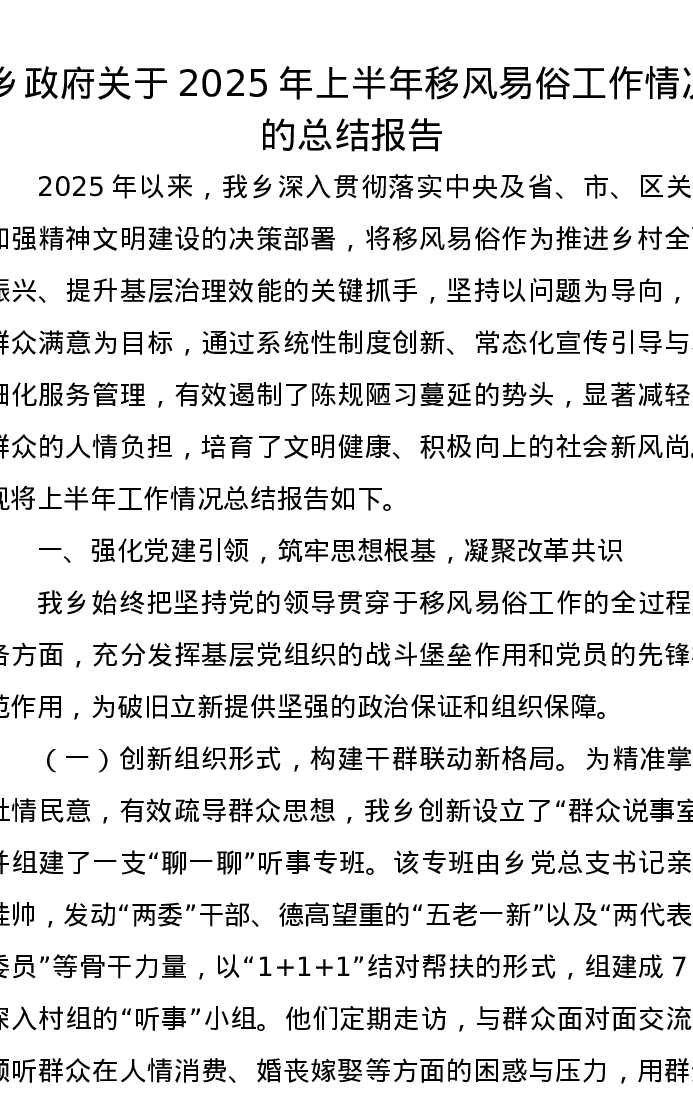 乡政府关于2025年上半年移风易俗工作情况的总结报告