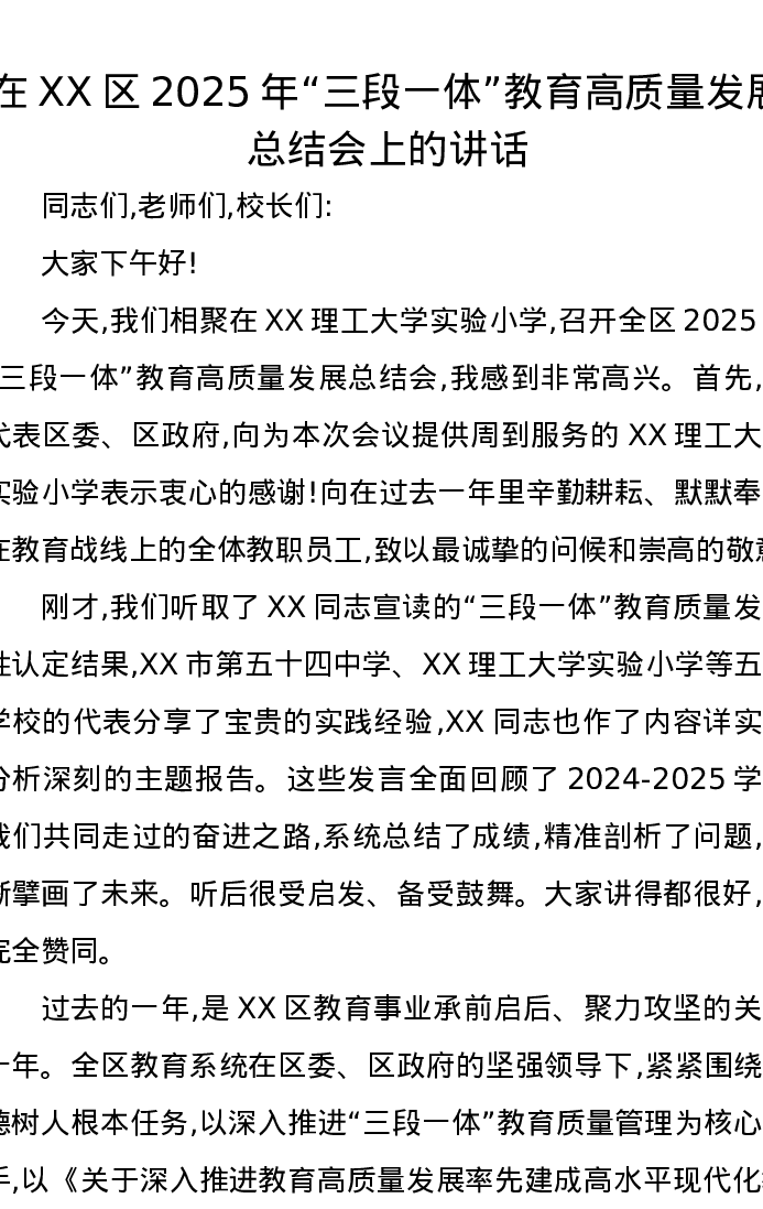 在XX区2025年“三段一体”教育高质量发展总结会上的讲话