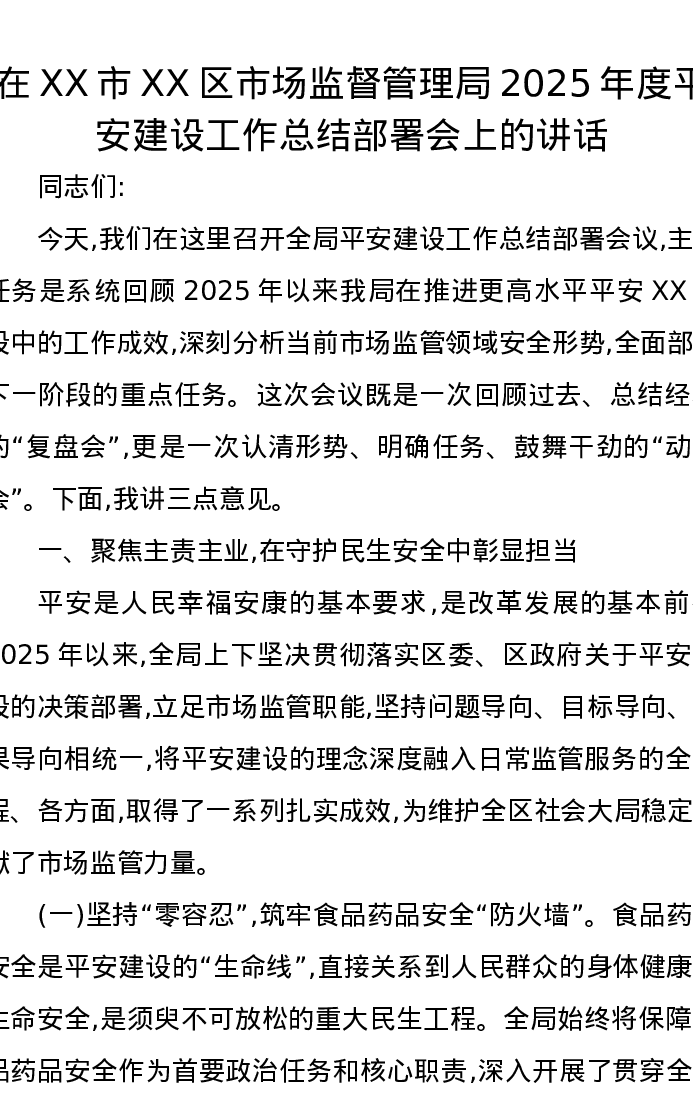 在XX市XX区市场监督管理局2025年度平安建设工作总结部署会上的讲话