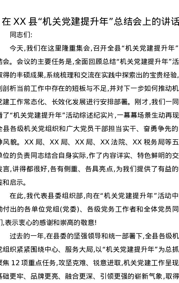 在XX县“机关党建提升年”总结会上的讲话
