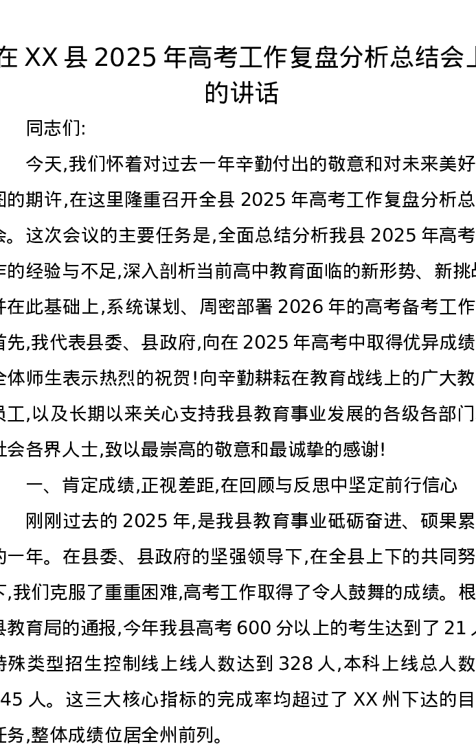 在XX县2025年高考工作复盘分析总结会上的讲话
