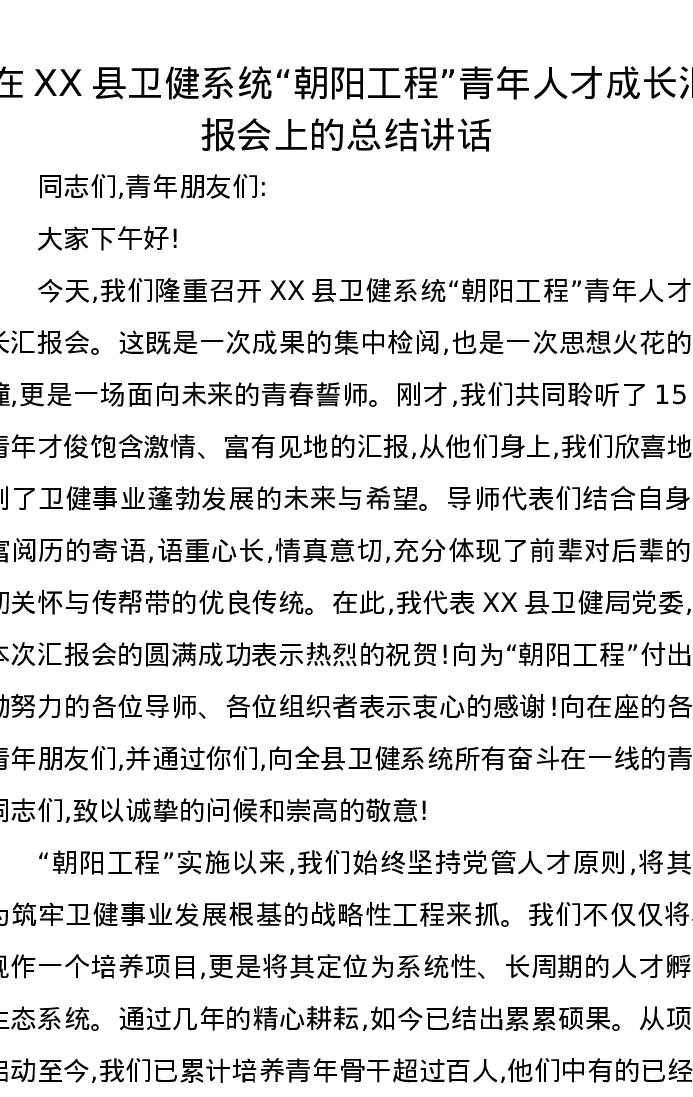 在XX县卫健系统“朝阳工程”青年人才成长汇报会上的总结讲话