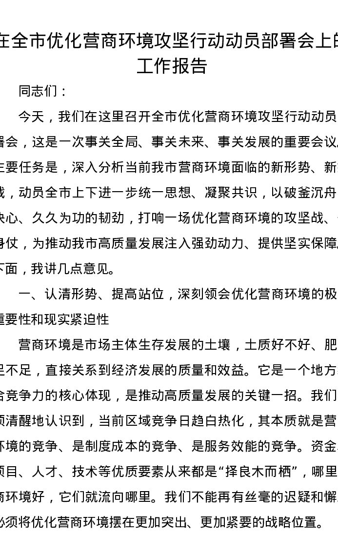 在全市优化营商环境攻坚行动动员部署会上的工作报告