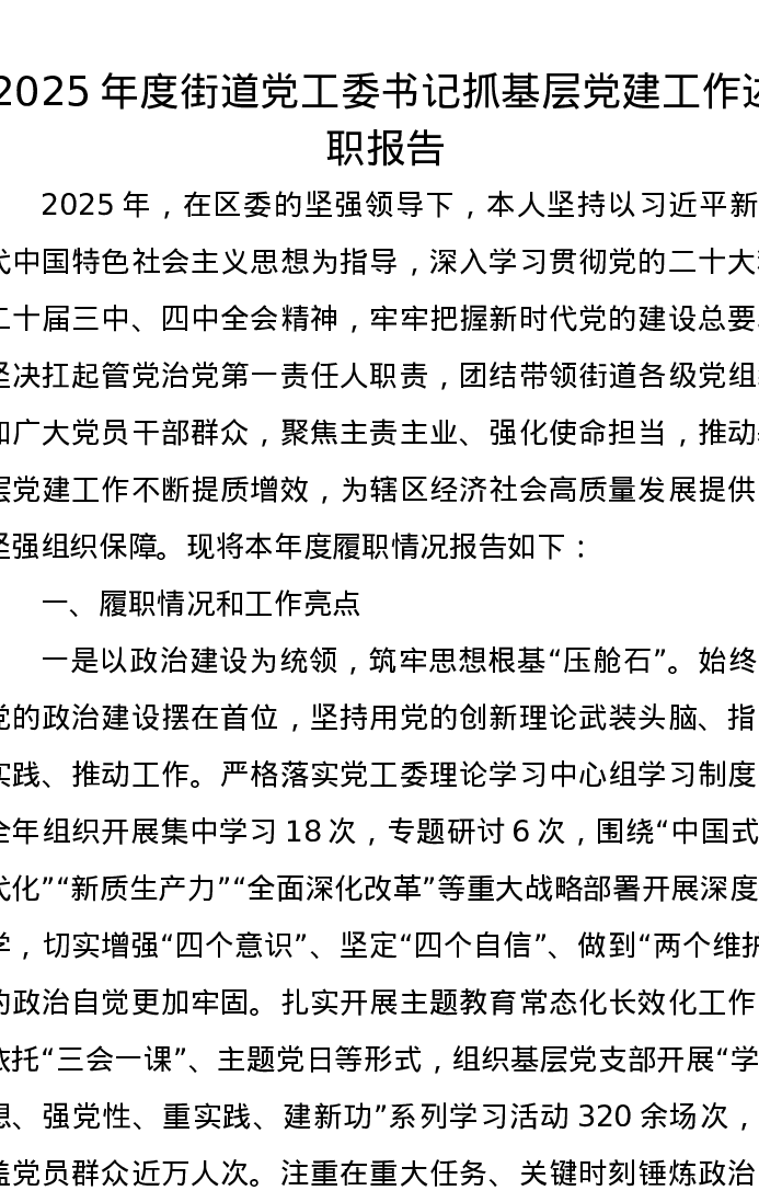 2025年度街道党工委书记抓基层党建工作述职报告