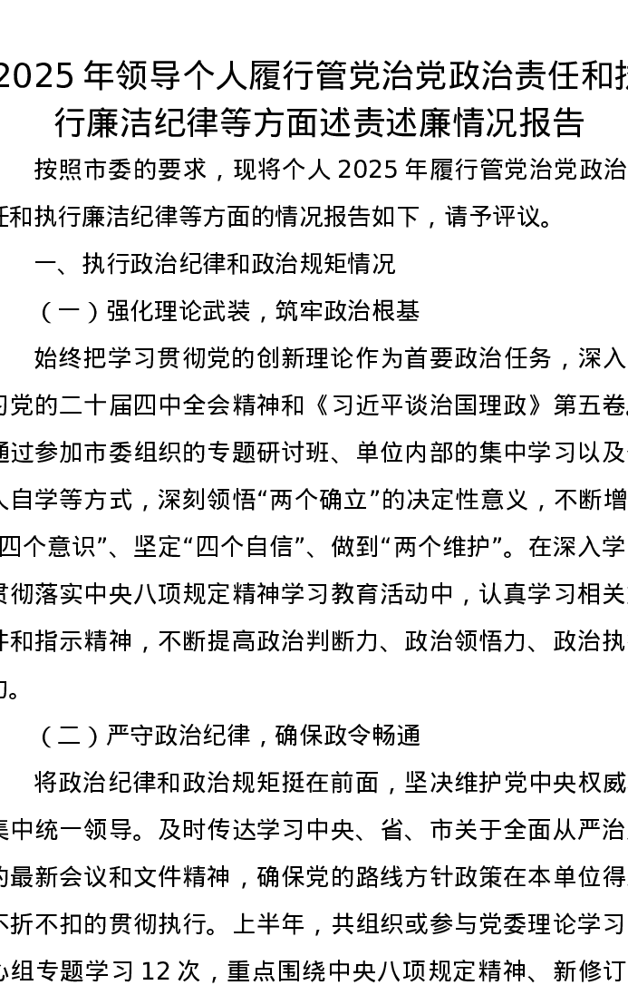 2025年领导个人履行管党治党政治责任和执行廉洁纪律等方面述责述廉情况报告