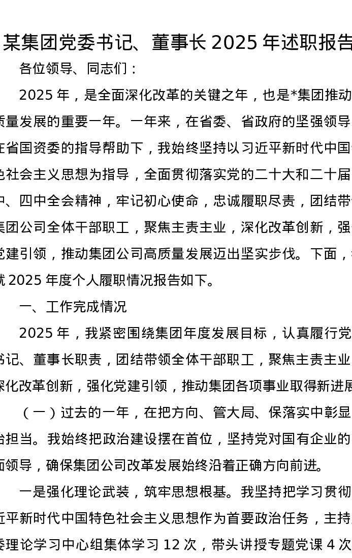 某集团党委书记、董事长2025年述职报告