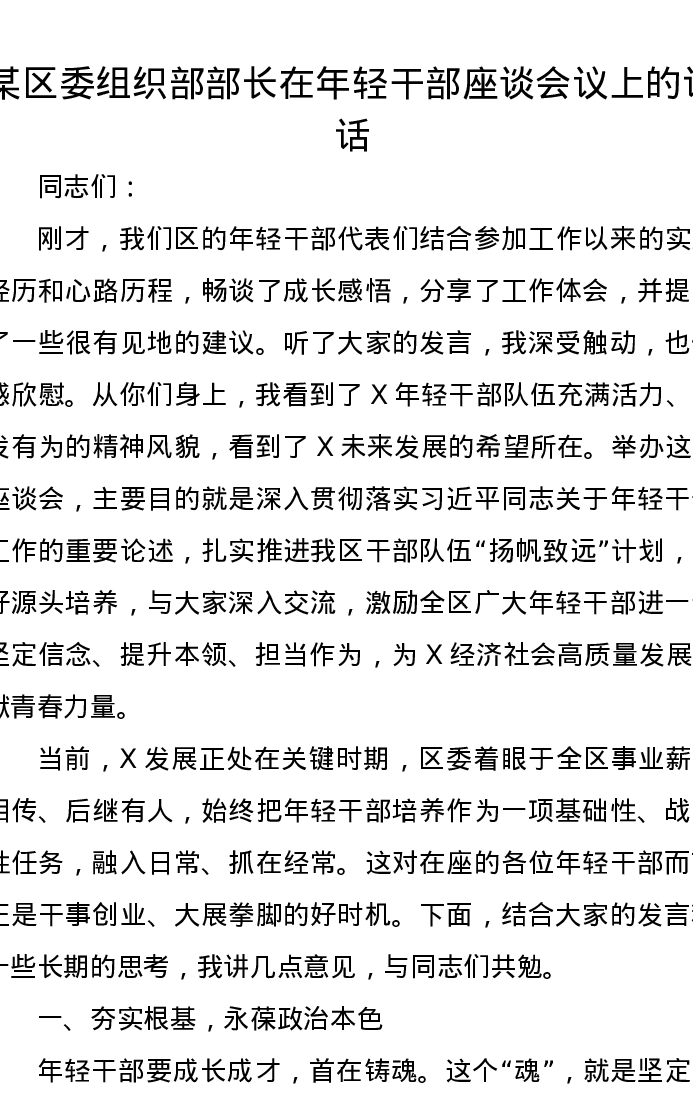 某区委组织部部长在年轻干部座谈会议上的讲话