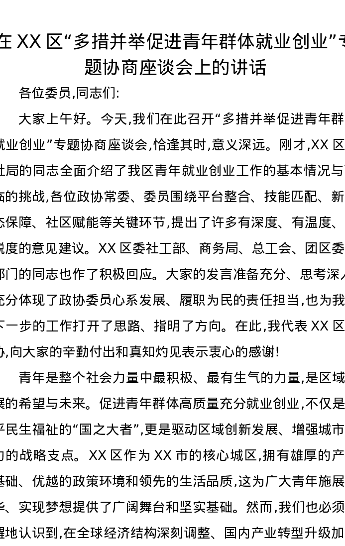 在XX区“多措并举促进青年群体就业创业”专题协商座谈会上的讲话