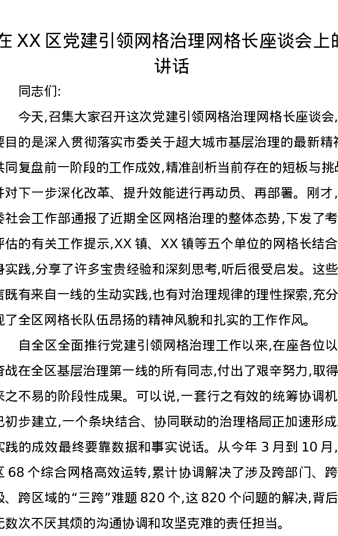 在XX区党建引领网格治理网格长座谈会上的讲话
