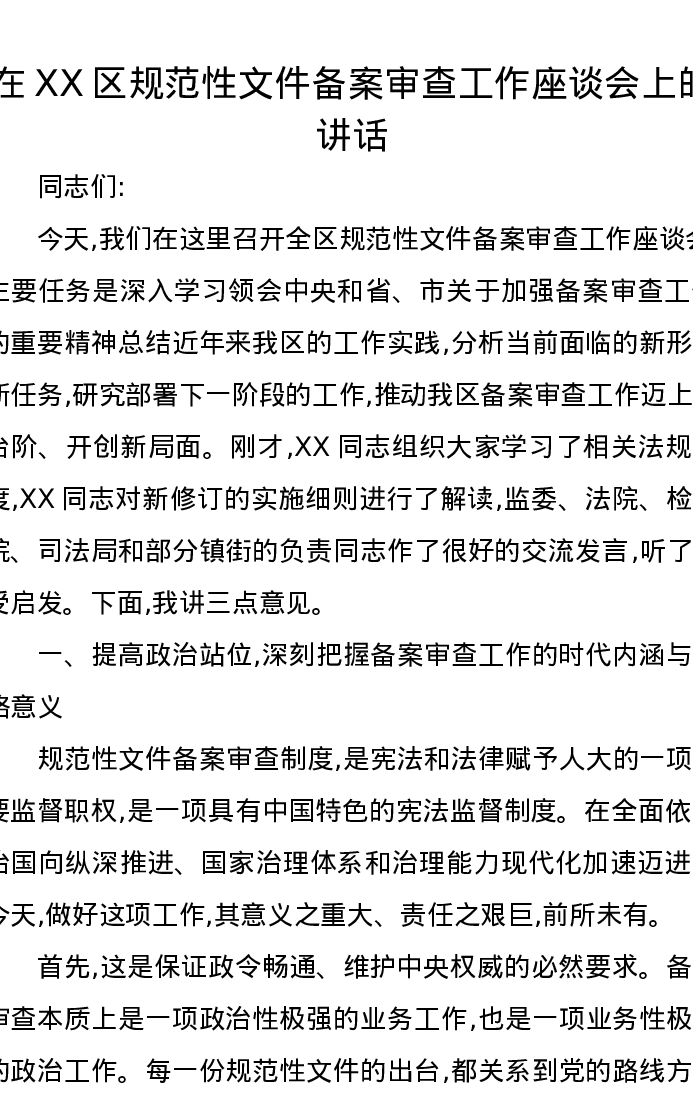 在XX区规范性文件备案审查工作座谈会上的讲话