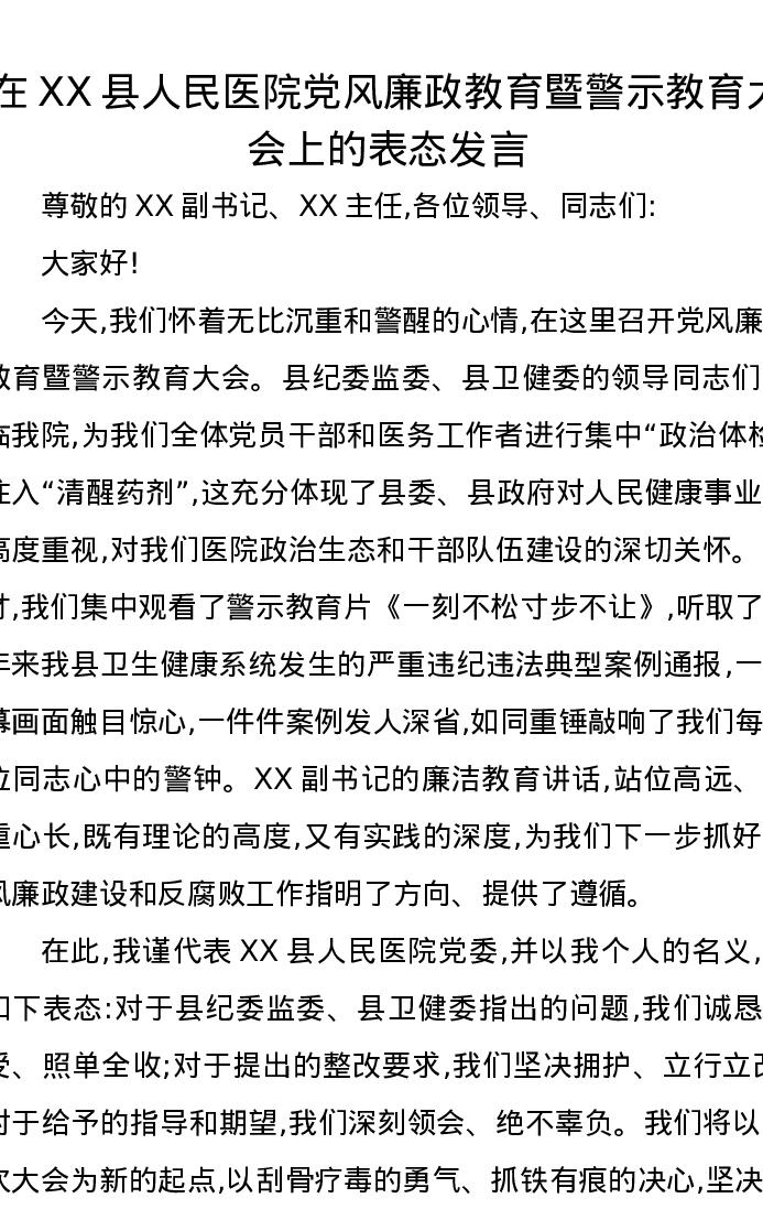 在XX县人民医院党风廉政教育暨警示教育大会上的表态发言
