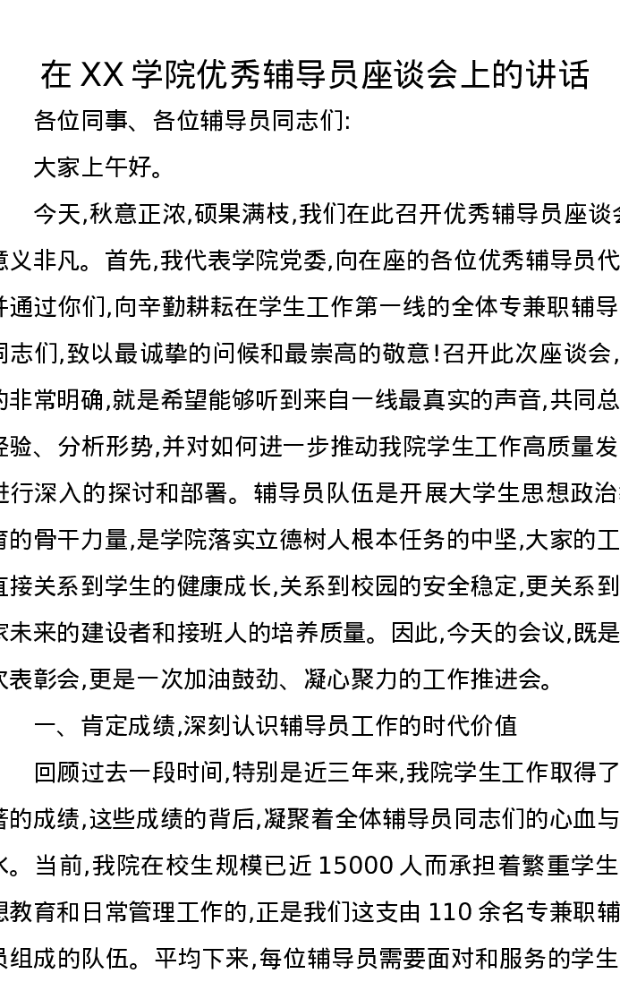 在XX学院优秀辅导员座谈会上的讲话