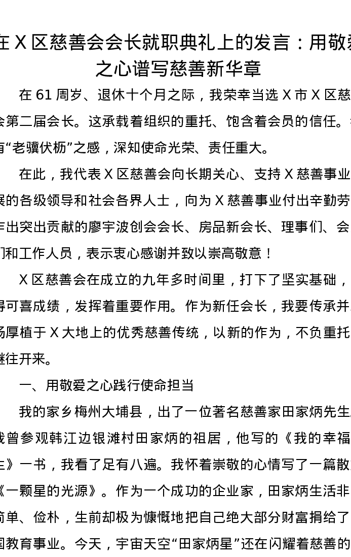 在X区慈善会会长就职典礼上的发言:用敬爱之心谱写慈善新华章