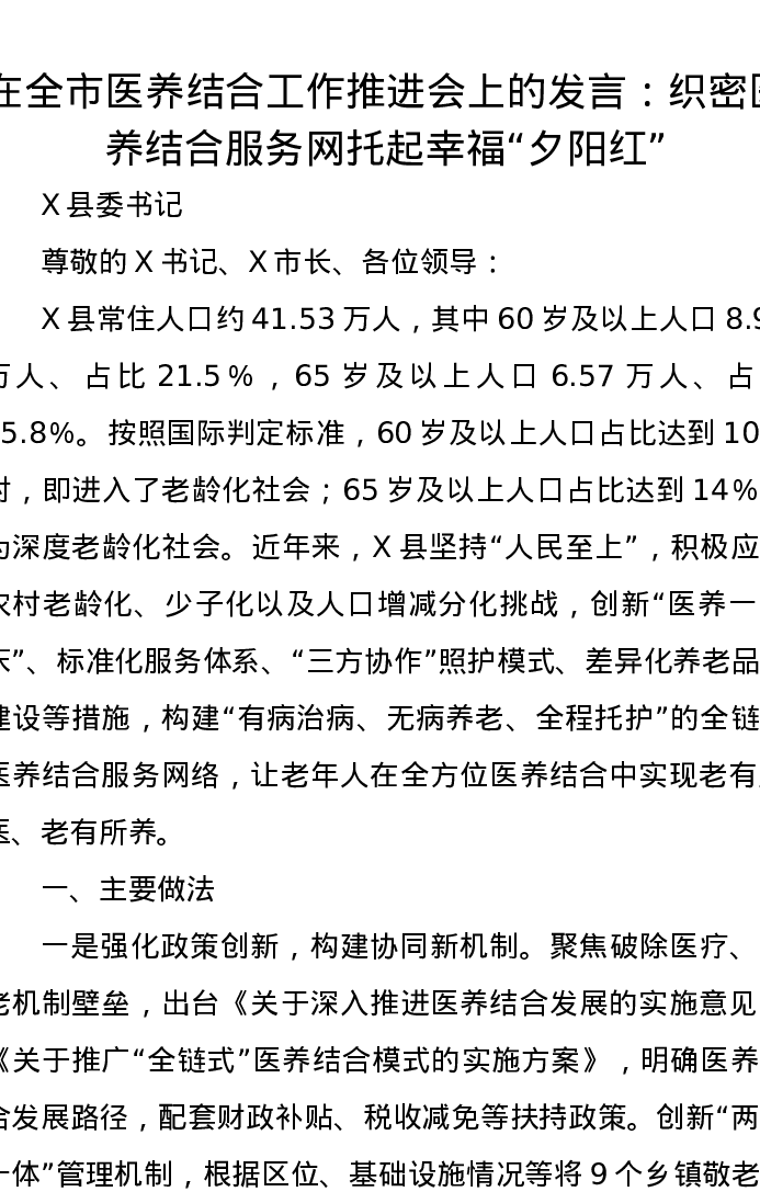 在全市医养结合工作推进会上的发言:织密医养结合服务网托起幸福“夕阳红”