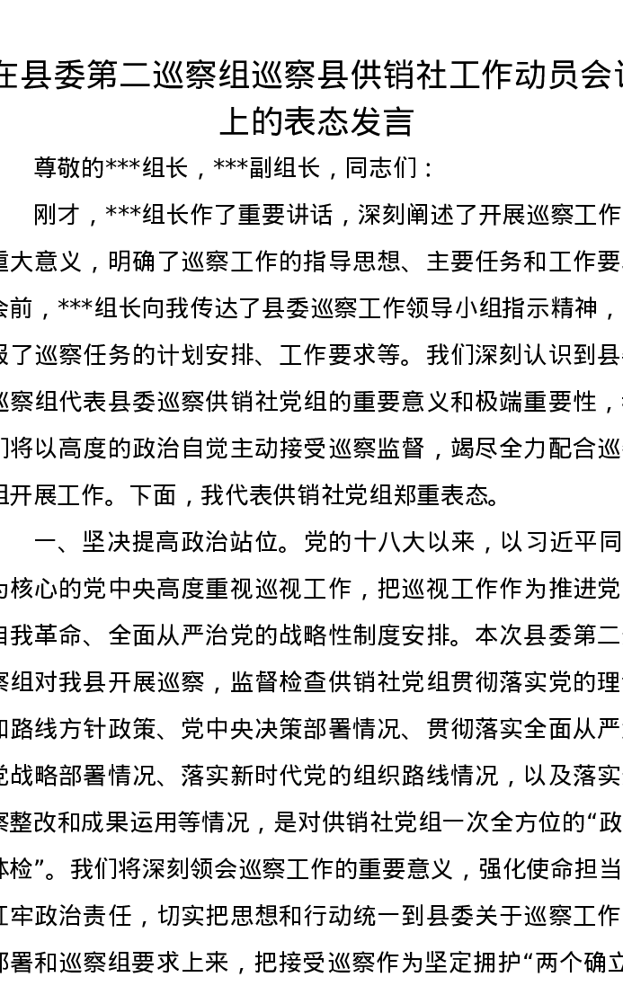 在县委第二巡察组巡察县供销社工作动员会议上的表态发言