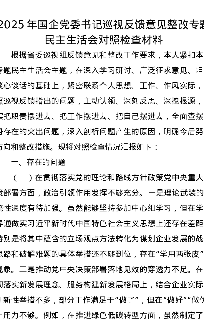 2025年国企党委书记巡视反馈意见整改专题xxxxx对照检查材料