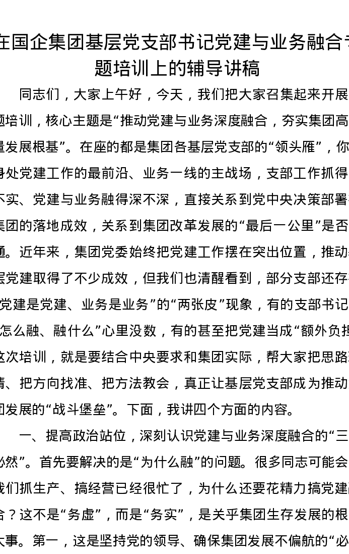 在国企集团基层党支部书记党建与业务融合专题培训上的辅导讲稿