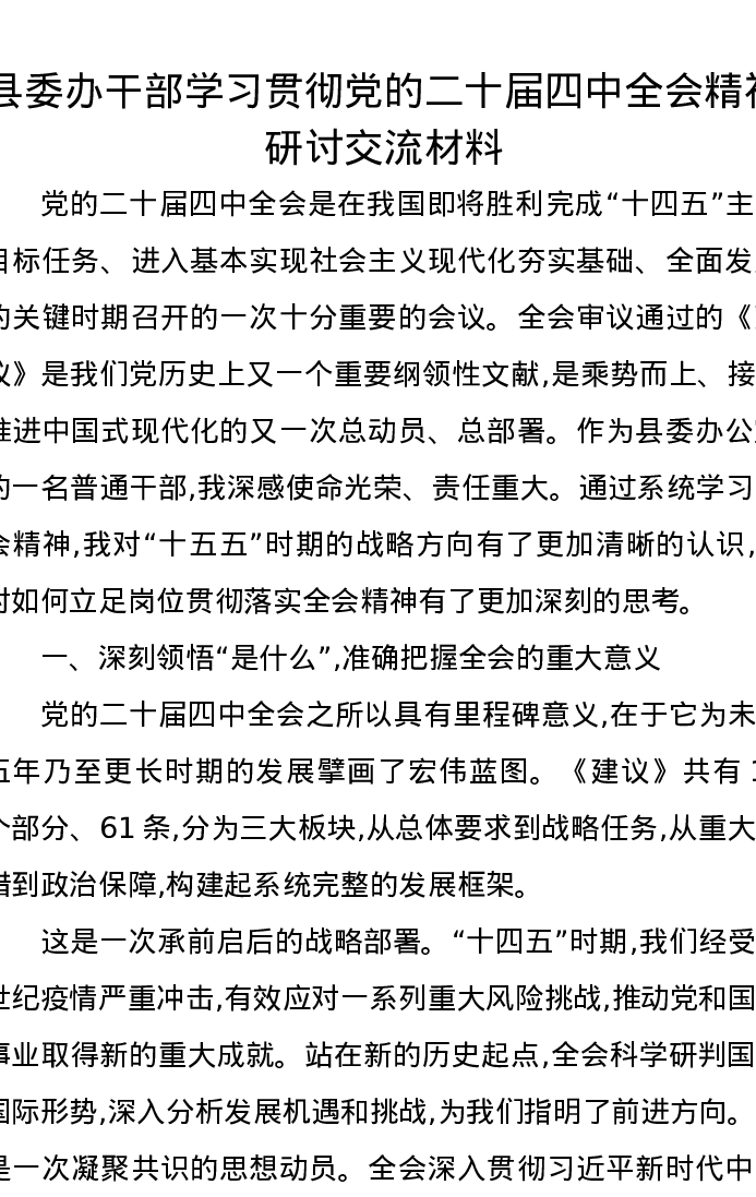 县委办干部学习贯彻党的二十届四中全会精神研讨交流发言材料
