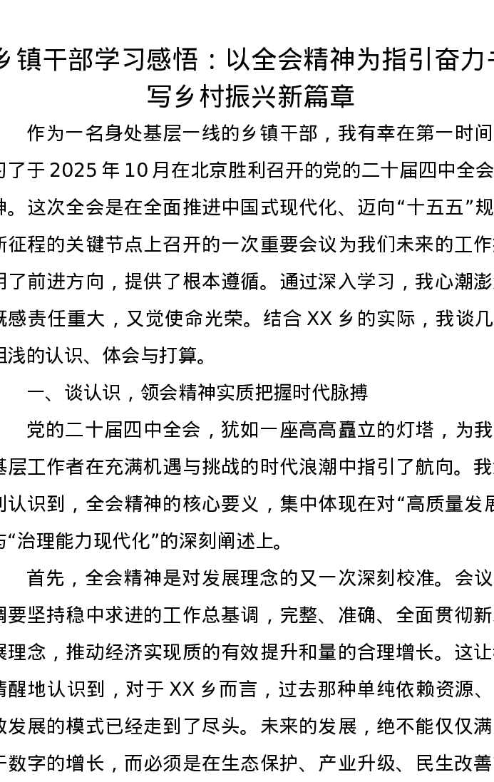 乡镇干部学习心得感悟:以二十届四中全会精神为指引奋力书写乡村振兴新篇章