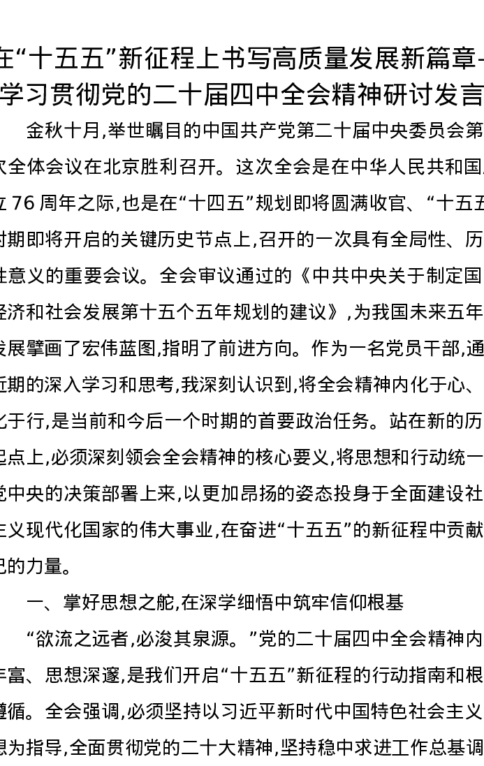 在“十五五”新征程上书写高质量发展新篇章—学习贯彻党的二十届四中全会精神研讨发言