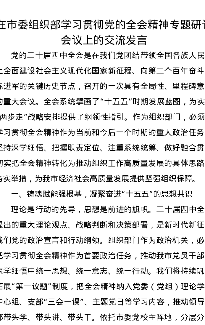 在市委组织部学习贯彻党的二十届四中全会精神专题研讨会议上的交流发言